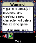 NOTE:  The application only allows a single game to be saved to the device file system.  If the player has started the process of creating a new character, and a save game file already exists in the application directory, the he is warned that the process will overwrite the existing game.