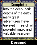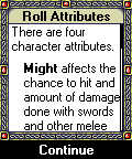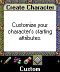 The character generation process is a multi-step procedure that will allow the player to determine his character's starting attributes and equipment, character sprite, and name.  Each step is preceded by a dialog containing information for the player, including the advice on creating a powerful character.  If the device screen is not large enough to display all of the help text, the player may use the [Up] and [Down] keys on the navigation key pad to scroll the text.  Pressing the [SELECT] key will close the dialog and continue to the next step of character creation.