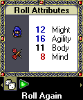 To roll another set of attribute values, the player must select the [Roll Again] menu item, and then press the [SELECT] key.  There are no limits to the number of times the attributes can be rolled.