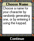 Step 3 – Character Name:  Every character needs a name.  The player may manually enter a name using the device key pad, or he may randomly retrieve one from a pre-defined list of names.